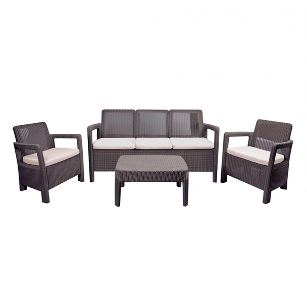 Мебелите са изработени от висококачествен изкуствен ратан в наситен тъмнокафяв цвят, което гарантира изключителна здравина и дълготрайност. Този иновативен материал е специално разработен да издържа на различни атмосферни влияния, включително деформация и вредното въздействие на UV лъчите. Неговата добра пропускливост на въздуха осигурява комфорт дори през най-топлите летни дни. За максимално удобство, триместното канапе и двата фотьойла са оборудвани с луксозни възглавници в елегантен кремав цвят, добавящи допълнителен слой комфорт и стил.