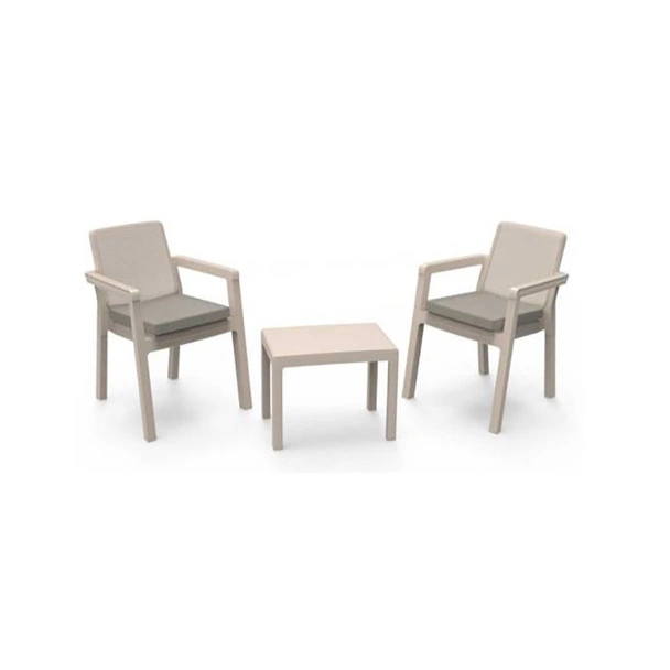 Създаден с мисъл за дълготрайна употреба, този градински комплект е произведен от първокласна полипропиленова суровина, което го прави изключително устойчив на всякакви атмосферни влияния – от жаркото лятно слънце до проливните есенни дъждове. Висококачественият материал гарантира, че мебелите ще запазят своя безупречен вид и функционалност години наред, без да се налага често подновяване. Включените възглавници, изработени от 100% полиестер, добавят допълнителен слой комфорт и завършват елегантния дизайн на комплекта. Те са меки, устойчиви и лесни за поддръжка, което осигурява приятно изживяване при всяко сядане.