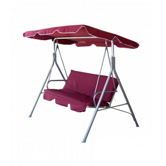 Градинска триместна люлка в цвят бордо със стабилна прахово боядисана метална конструкция.