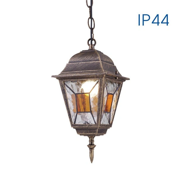 Фенерът е с четиристенен алуминиев корпус в цвят античен месинг и декоративно стъкло тип "витраж".