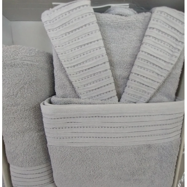 Съдържание: 1 брой луксозен халат за баня, 1 брой голяма кърпа за тяло, 1 брой кърпа за лице и ръце