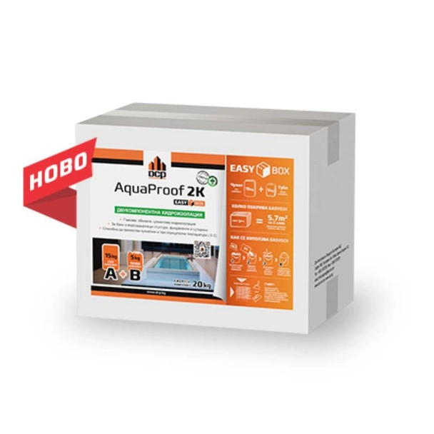 AquaProof 2К EASYBOX е двукомпонентно гъвкаво, циментово покритие с модифициран полимер, което се използва за хидроизолация на вътрешни и външни структури.