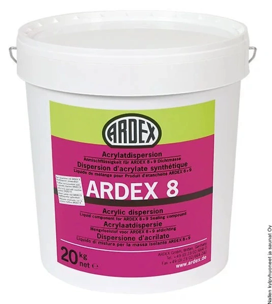 ARDEX 8 - акрилатна дисперсия без разредители с обемно тегло от около 1,0 кг. За обработването ARDEX 8 и 9 компоненти се смесват. Във втвърдено състояние алтернативната хидроизолация е водоустойчива и много еластична, не въздейства оцветяващо върху циментови фугиращи маси.