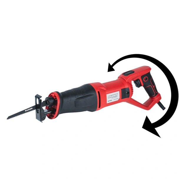 Саблен трион RD-RS38 на марката RAIDER с въртяща се ръкохватка, подходящ за рязане на дърво, метални тръби, PVC, тухли и други материали.