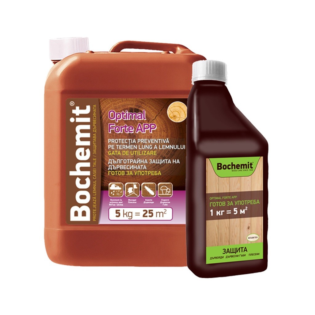 Качествата и характеристиките на Optimal Forte APP са напълно идентични с тези на концентрирания Bochemit OPTI F, но спестяват време и усилия за разреждане. Основната му функция е да удължи живота на дървесината, запазвайки всички нейни естествени физически и естетически характеристики, включително цялост, якост, здравина и красивия първоначален вид на материала. Импрегнантът осигурява мощна превантивна защита срещу най-често срещаните биологични увреждания: