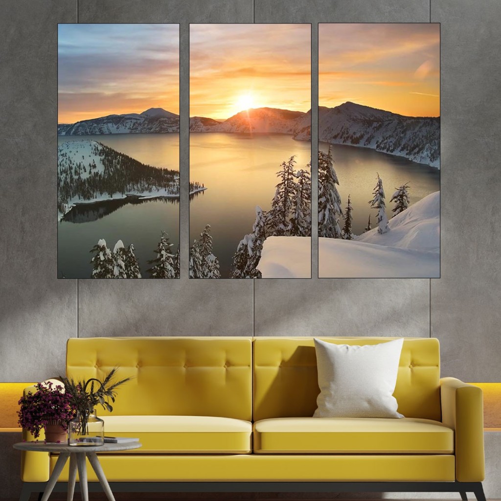 Декорация за стена (картина, пано) с мотив "Изгрев над снежно езеро - картина пано за стена". Изработена от олекотено PVC с дебелина 5 мм или канава от 100% памук, опъната върху дървена подрамка с дебелина 5 см. Изображението се печата с висококачествен UV печат, което е гаранция за запазване на цветовете с години!