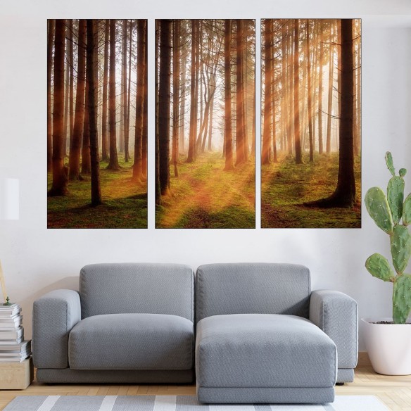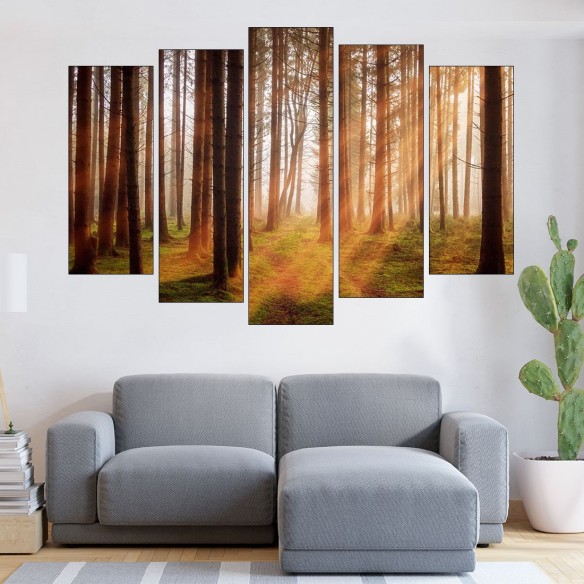 Декорация за стена (картина, пано) с мотив "Изгрев в борова гора - картина пано за стена". Изработена от олекотено PVC с дебелина 5 мм или канава от 100% памук, опъната върху дървена подрамка с дебелина 5 см. Изображението се печата с висококачествен UV печат, което е гаранция за запазване на цветовете с години!