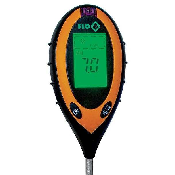 Градински електронен измервател 4 в 1 FLO VAL Import (модел 23440), измерващ четири стойности: влага в почвата, киселинност pH на почвата, температуара на почвата и интензивност на светлината.