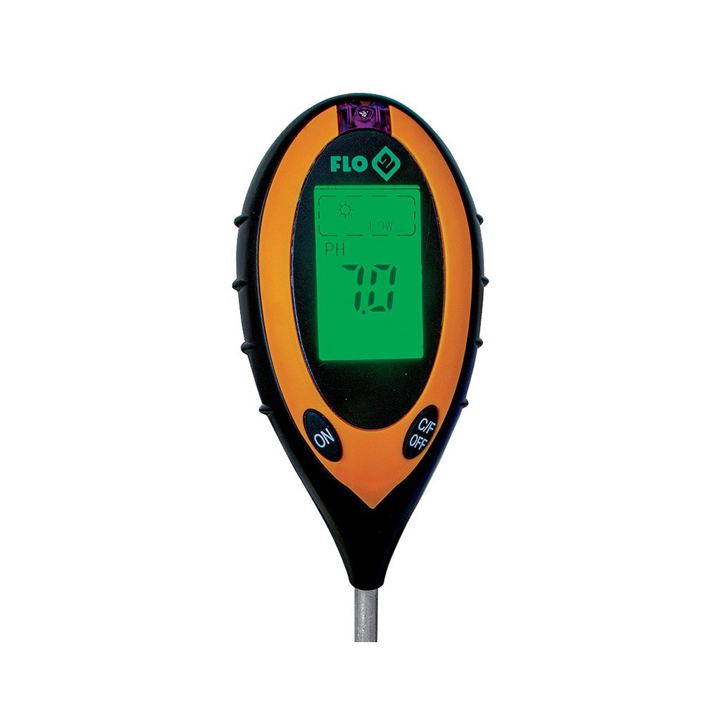 Градински електронен измервател 4 в 1 FLO VAL Import (модел 23440), измерващ четири стойности: влага в почвата, киселинност pH на почвата, температуара на почвата и интензивност на светлината.