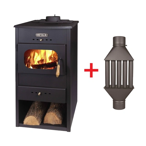 Металик Хит 015 е мощна и практична камина на твърдо гориво, която съчетава висока отоплителна ефективност с възможност за традиционно готвене. Със своята максимална мощност от 13 kW, тя е идеалното решение за помещения с площ около 55 m2. Корпусът е изработен от подсилена стоманена ламарина в черен матиран цвят, допълнен от изтънчени златисти месингови елементи, които придават луксозен завършек на уреда.