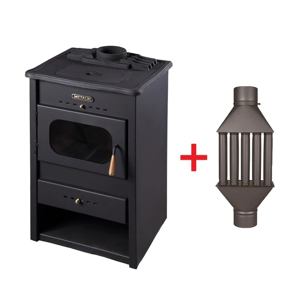 Металик 019 е мощна камина на твърдо гориво, която съчетава солидна отоплителна мощ с практичността на готварски уред. Със своята максимална мощност от 18 kW, тя е отлично решение за отопление на помещения с площ около 64 m2. Изработена от здрава, висококачествена ламарина в черен матиран цвят и акцентирана със златисти месингови елементи, камината придава изтънченост и класически уют на всеки дом.