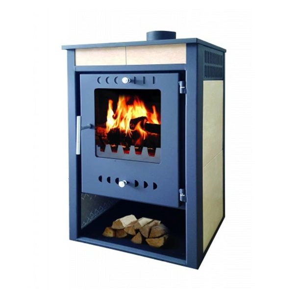 Камината се отличава със своята специфична конструкция с двойни стени, разположени отстрани и отзад, които осигуряват естествена въздушна вентилация и повишават безопасността при работа. Горивната камера е надеждно защитена с шамотни тухли и е оборудвана с висококачествено керамично стъкло за визуален контрол на пламъка. Водната риза е тип серпентина, което гарантира бърз и ефективен топлообмен. За допълнително удобство е предвидена ниша, разположена в основата, която служи за предварително изсушаване на дървата, подобрявайки качеството на горене.