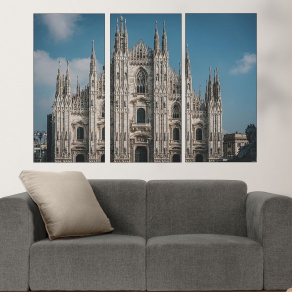 Декорация за стена (картина, пано) с мотив "Катедралата Дуомо в Милано - картина пано за стена". Изработена от олекотено PVC с дебелина 5 мм или канава от 100% памук, опъната върху дървена подрамка с дебелина 5 см. Изображението се печата с висококачествен UV печат, което е гаранция за запазване на цветовете с години!