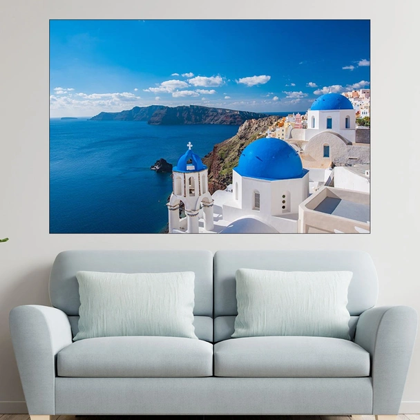 Декорация за стена (картина, пано) с мотив "Синя църква в Санторини - картина пано за стена". Изработена от олекотено PVC с дебелина 5 мм или канава от 100% памук, опъната върху дървена подрамка с дебелина 5 см. Изображението се печата с висококачествен UV печат, което е гаранция за запазване на цветовете с години!