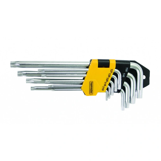 Комплект от 9 броя къси шестограми торкс с отвор на марката Topmaster, изработени от висококачествена хром-ванадиева стомана.