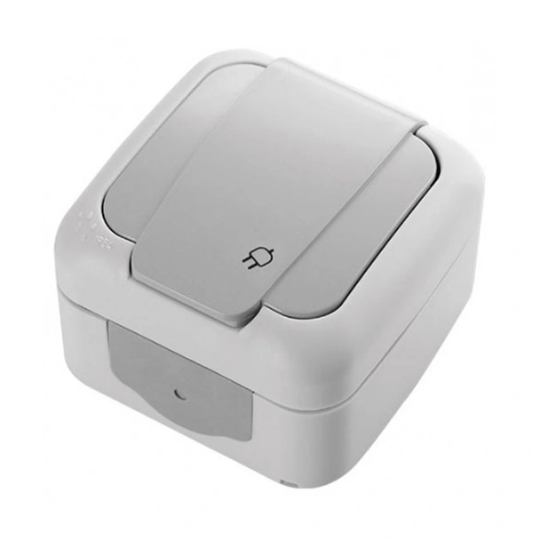 Влагоустойчив контакт от серията Palmiye на Viko by Panasonic в сив цвят, предназначен за открит монтаж.