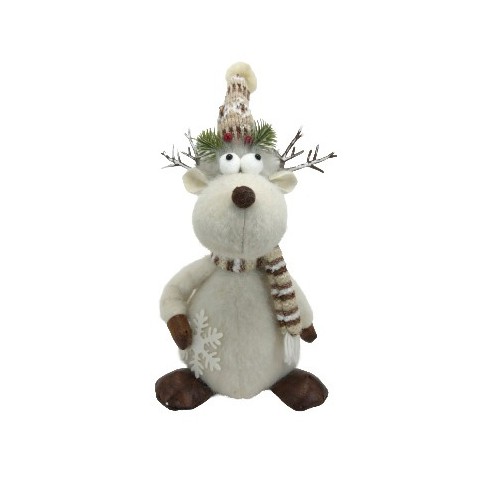 Еленът Дашър впечатлява с меки бели тонове, пухкава козина и красиво изработени аксесоари – пъстър шал и фина шапка, които му придават типично зимно излъчване. Височината от 40 см го прави забележим акцент във всяка стая. Независимо дали е поставен до елхата, на пода или върху камината, той внася уют и празнично настроение в пространството.