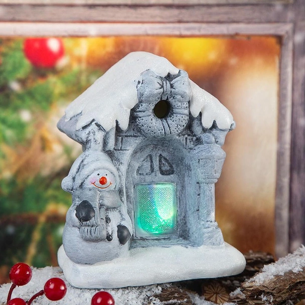 Светеща коледна къща Приказка със снежен покрив, снежко и коледен венец, подходяща за декорация за дома или работното място.