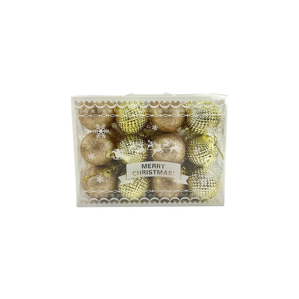Този богат комплект от 24 златни коледни топки е създаден, за да превърне вашата елха в истинско тържество на светлината и топлината. Златистият цвят е класически символ на празничното благоденствие и внася неповторимо чувство за лукс във всеки интериор. Комбинацията от различни текстури позволява на светлините от гирлянда да се пречупват по различен начин, създавайки динамична и визуално интересна украса. Независимо дали предпочитате традиционен стил или по-екстравагантна визия, тези декоративни елементи ще придадат завършен и изтънчен вид на вашето празнично дърво.