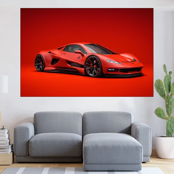Декорация за стена (картина, пано) с мотив "Червена спортна кола - картина пано за стена". Изработена от олекотено PVC с дебелина 5 мм или канава от 100% памук, опъната върху дървена подрамка с дебелина 5 см. Изображението се печата с висококачествен UV печат, което е гаранция за запазване на цветовете с години!