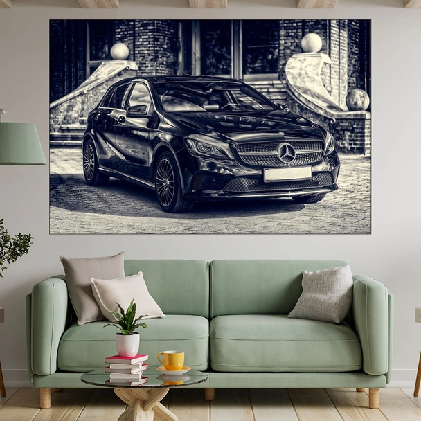 Декорация за стена (картина, пано) с мотив "Мercedes - елегантна кола - картина пано за стена". Изработена от олекотено PVC с дебелина 5 мм или канава от 100% памук, опъната върху дървена подрамка с дебелина 5 см. Изображението се печата с висококачествен UV печат, което е гаранция за запазване на цветовете с години!