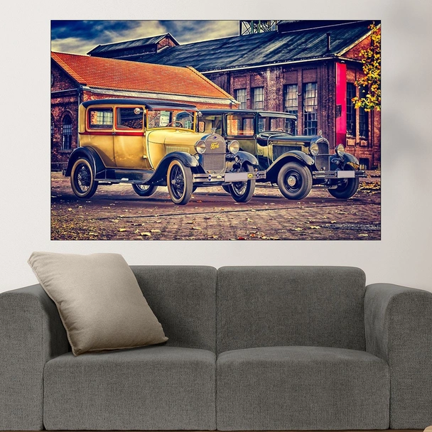 Декорация за стена (картина, пано) с мотив "Ретро автомобил FORD - картина пано за стена". Изработена от олекотено PVC с дебелина 5 мм или канава от 100% памук, опъната върху дървена подрамка с дебелина 5 см. Изображението се печата с висококачествен UV печат, което е гаранция за запазване на цветовете с години!