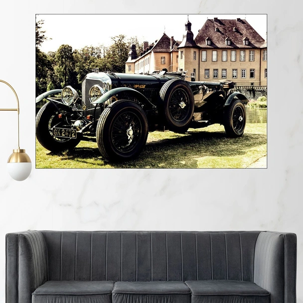 Декорация за стена (картина, пано) с мотив "Ретро автомобил пред замък - картина пано за стена". Изработена от олекотено PVC с дебелина 5 мм или канава от 100% памук, опъната върху дървена подрамка с дебелина 5 см. Изображението се печата с висококачествен UV печат, което е гаранция за запазване на цветовете с години!