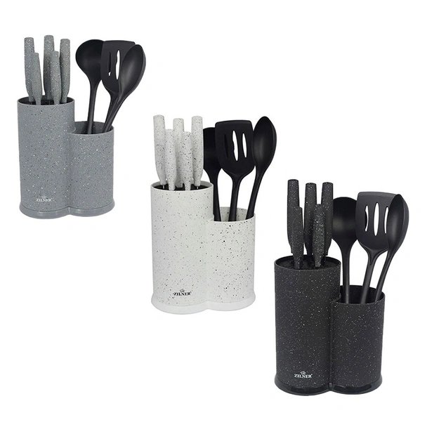 Комплектът ZL 5129 ZILNER съдържа универсален нож с дължина 20 см, нож за хляб с дължина 20 см, нож на готвача с дължина 20 см, универсален нож с дължина 12.7 см, нож за белене с дължина 9 см, черпак, лъжица за сервиране, решетъчна лъжица и стойка.