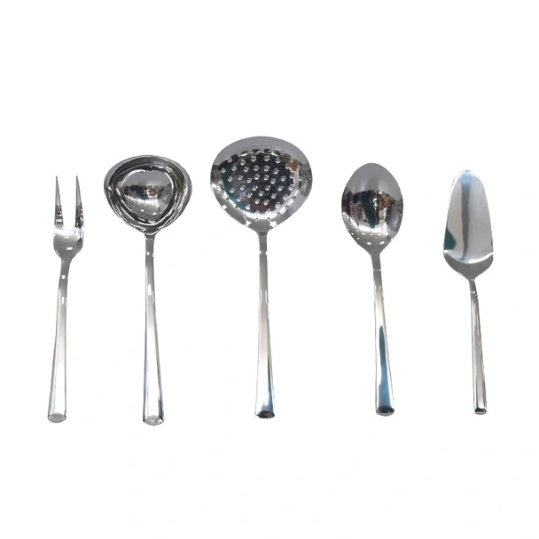 Комплектът съдържа: вилица за месо, решетъчна лъжица, лъжица за сервиране, шпатула за сервиране на торта, черпак.