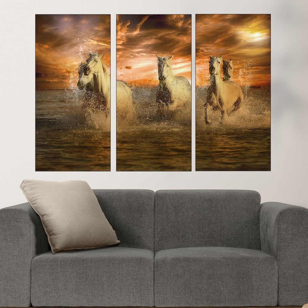 Декорация за стена (картина, пано) с мотив "Препускащи коне на плажа - картина пано за стена". Изработена от олекотено PVC с дебелина 5 мм или канава от 100% памук, опъната върху дървена подрамка с дебелина 5 см. Изображението се печата с висококачествен UV печат, което е гаранция за запазване на цветовете с години!