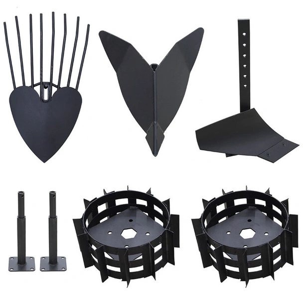 Инвентар за мотофреза Gardenia, състоящ се от картофовадач, браздир, плуг, метални колела и полуоски.