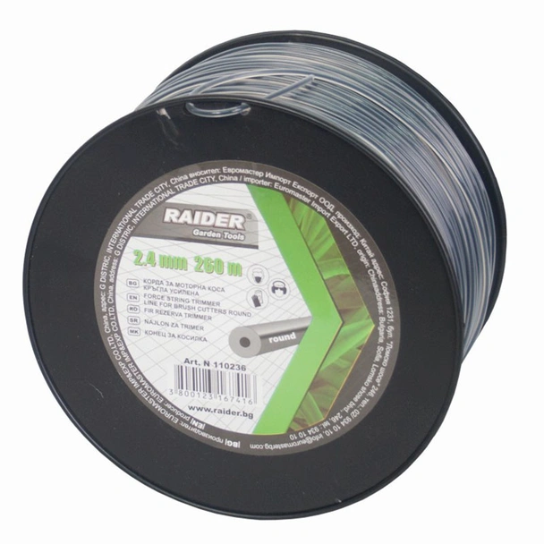 Koрда за коса Raider с кръгло сечение e с диаметър 2.4мм и дължина от 260м. Изработена е от износоустойчив материал, запазващ еластичността си дълго време, с метална нишка. Тя е двукомпонентна и е 40% по-ефективна от обикновената корда. Устойчива е на температура до 280°C. Подходяща е за всички марки бензинови тримери за трева.