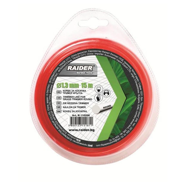 Корда за тример на марката RAIDER с кръгло сечение, с диаметър 1.3 мм и дължина 15 м.
