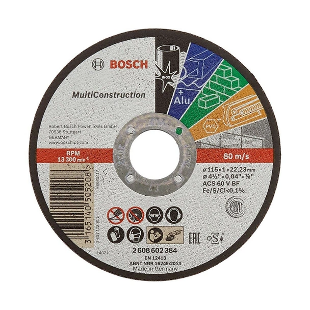 Multi Construction Rapido 2608602384 е диск на BOSCH, който е предназначен за рязане на метали, газобетон, метални тръби, цветни метали и твърд камък. Интересен факт е че специалната абразивна смес позволява работа върху различни материали, което автоматично го прави този диск със широк спектър на работа. Тънкият дизайн на диска предлага лесно и бързо рязане с малко усилие, по-малко шум и минимален прах.