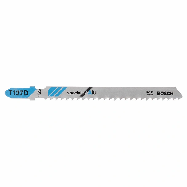 Нож за прободен трион "T 127 D" на марката Bosch, осигуряващ чисти и прави срезове в мека дървесина и шперплат.