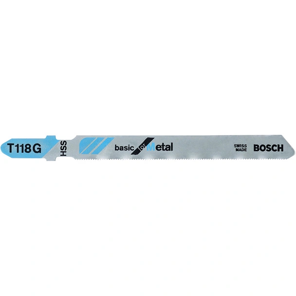 Нож за прободен трион "T 118 G" на марката Bosch, осигуряващ чисти и прави срезове в метал.