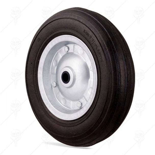 Колело за количка плътно, черно на цвят на фирма YAPARLAR е предназначено за строителни и градински колички. изработено е от плътна гума, а джантата е изработена от галванизирана стомана и полиамидна втулка.