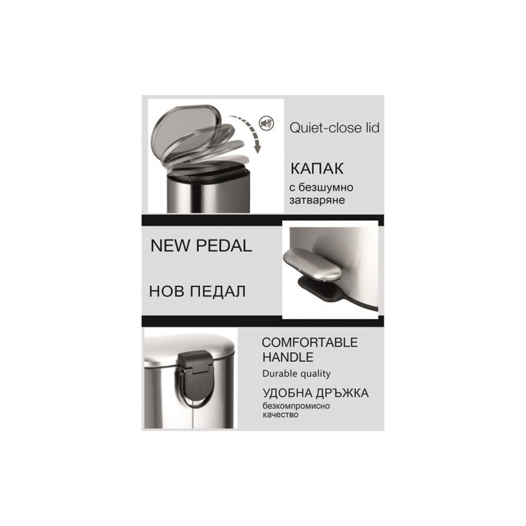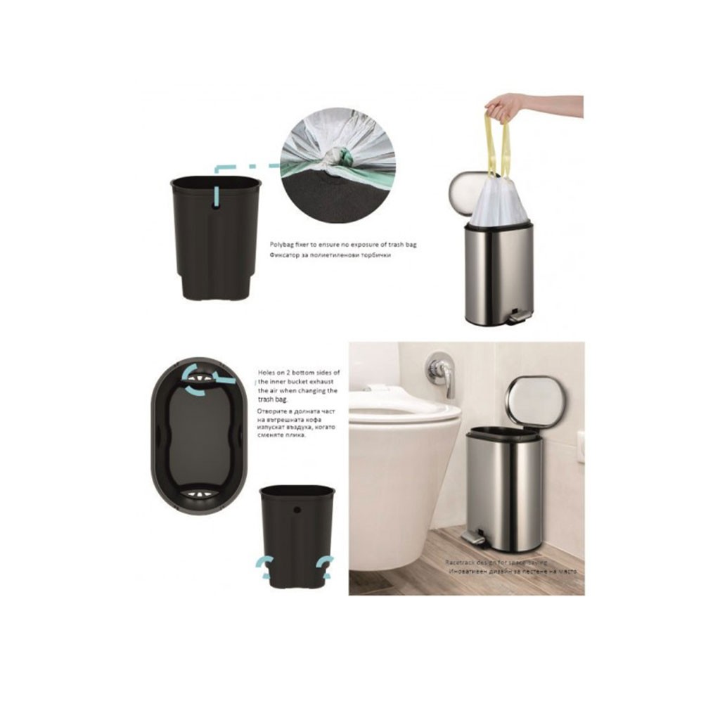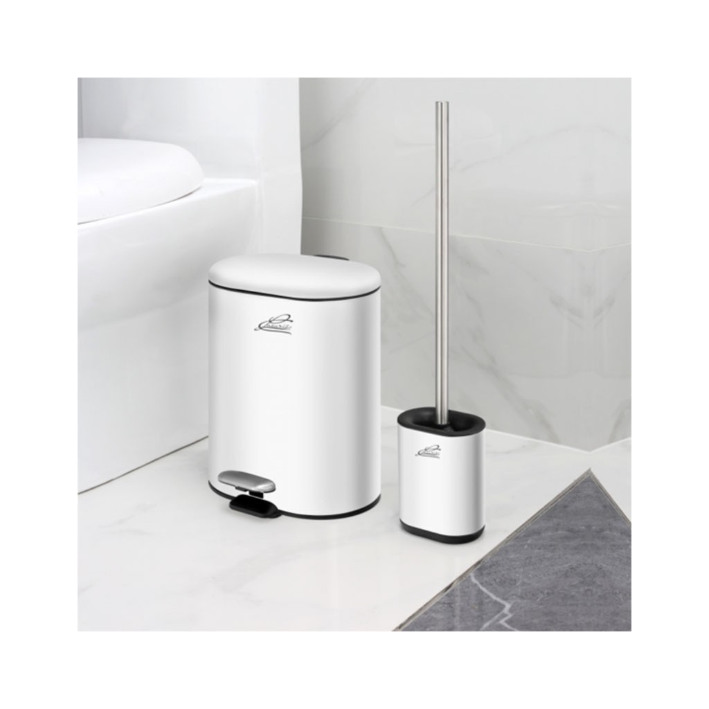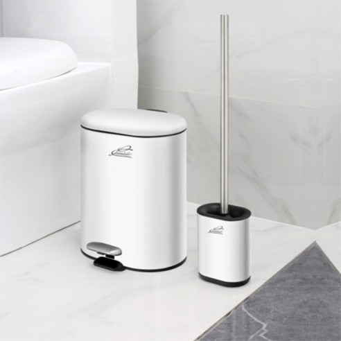Комплектът е създаден с внимание към всеки детайл, за да улесни вашето ежедневие. Тоалетното кошче с вместимост от 6 литра е изработено от висококачествена неръждаема стомана, гарантираща дълготрайна издръжливост и устойчивост на влага. Външното покритие в бял мат не само изглежда стилно, но и е обработено с технология "Anti-fingerprint", която предотвратява появата на отпечатъци и улеснява почистването.