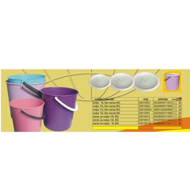 Пластмасовият капак за кофа с вместимост 10 литра е практичен аксесоар, предназначен да осигури плътно затваряне и защита на съдържанието в кофата. Той е незаменим помощник в домакинството, градината или при ремонтни дейности, като предотвратява разливането на течности, разпиляването на сухи материали и разпространението на неприятни миризми. Дизайнът му е съобразен със стандартните размери на 10-литровите кофи, осигурявайки стабилно и сигурно прилягане.