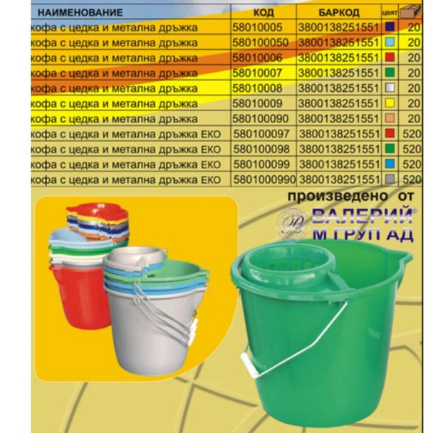 Пластмасова кофа, оборудвана с метална дръжка и цедка. Кофата е практична, лека и удобна за пренасяне.