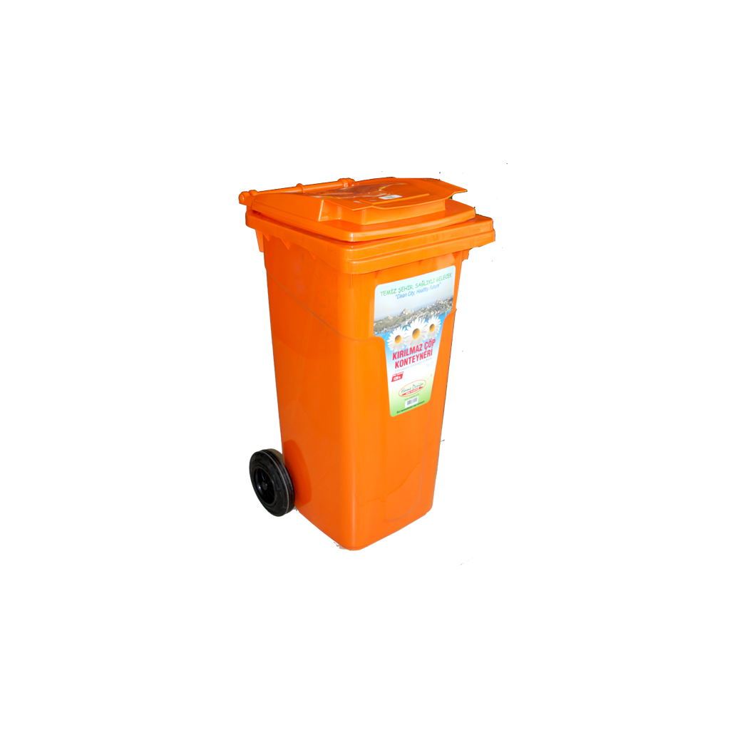 Кош за битови отпадъци в оранжев цвят, изработен от пластмаса с вместимост 120 л. Кошът е удобен за местене, благодарение на монтираните колела и лекият материал, от който е изработен. . Това е ефективно решение за малки населени места, където почиствателната техника минава по-рядко.