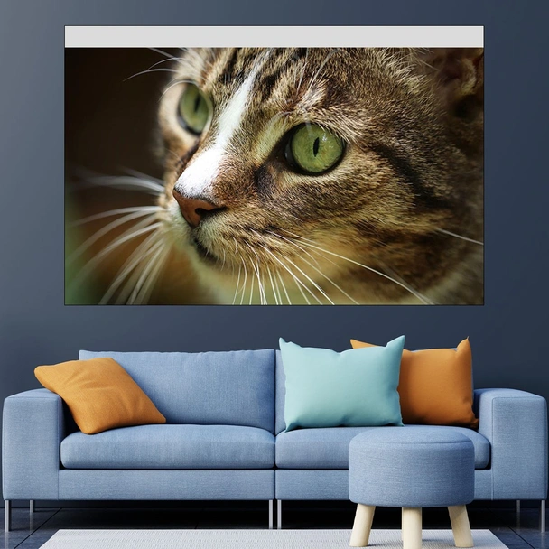 Декорация за стена (картина, пано) с мотив "Близък кадър на котка - картина пано за стена". Изработена от олекотено PVC с дебелина 5 мм или канава от 100% памук, опъната върху дървена подрамка с дебелина 5 см. Изображението се печата с висококачествен UV печат, което е гаранция за запазване на цветовете с години!