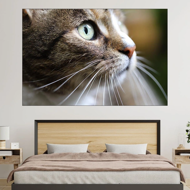 Декорация за стена (картина, пано) с мотив "Макро снимка на коте - картина за стена". Изработена от олекотено PVC с дебелина 5 мм или канава от 100% памук, опъната върху дървена подрамка с дебелина 5 см. Изображението се печата с висококачествен UV печат, което е гаранция за запазване на цветовете с години!
