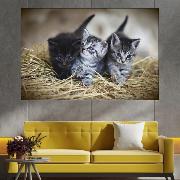 Декорация за стена (картина, пано) с мотив "Три малки котета - картина пано за стена". Изработена от олекотено PVC с дебелина 5 мм или канава от 100% памук, опъната върху дървена подрамка с дебелина 5 см. Изображението се печата с висококачествен UV печат, което е гаранция за запазване на цветовете с години!