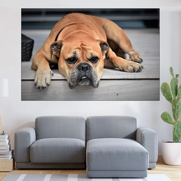 Декорация за стена (картина, пано) с мотив "Легнал булдог - картина пано за стена". Изработена от олекотено PVC с дебелина 5 мм или канава от 100% памук, опъната върху дървена подрамка с дебелина 5 см. Изображението се печата с висококачествен UV печат, което е гаранция за запазване на цветовете с години!