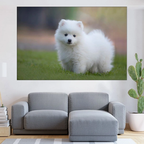 Декорация за стена (картина, пано) с мотив "Малък бял японски шпиц - картина пано за стена". Изработена от олекотено PVC с дебелина 5 мм или канава от 100% памук, опъната върху дървена подрамка с дебелина 5 см. Изображението се печата с висококачествен UV печат, което е гаранция за запазване на цветовете с години!