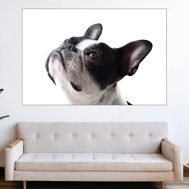 Декорация за стена (картина, пано) с мотив "Портрет на френски булдог - картина пано за стена". Изработена от олекотено PVC с дебелина 5 мм или канава от 100% памук, опъната върху дървена подрамка с дебелина 5 см. Изображението се печата с висококачествен UV печат, което е гаранция за запазване на цветовете с години!