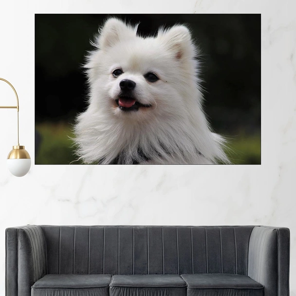 Декорация за стена (картина, пано) с мотив "Потрет на пухкав шпиц - картина пано за стена". Изработена от олекотено PVC с дебелина 5 мм или канава от 100% памук, опъната върху дървена подрамка с дебелина 5 см. Изображението се печата с висококачествен UV печат, което е гаранция за запазване на цветовете с години!