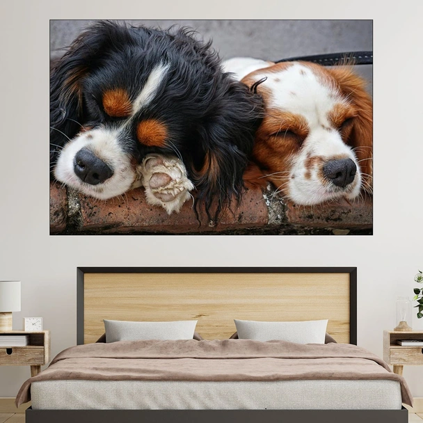 Декорация за стена (картина, пано) с мотив "Спящи кученца Кавалер - картина пано за стена". Изработена от олекотено PVC с дебелина 5 мм или канава от 100% памук, опъната върху дървена подрамка с дебелина 5 см. Изображението се печата с висококачествен UV печат, което е гаранция за запазване на цветовете с години!