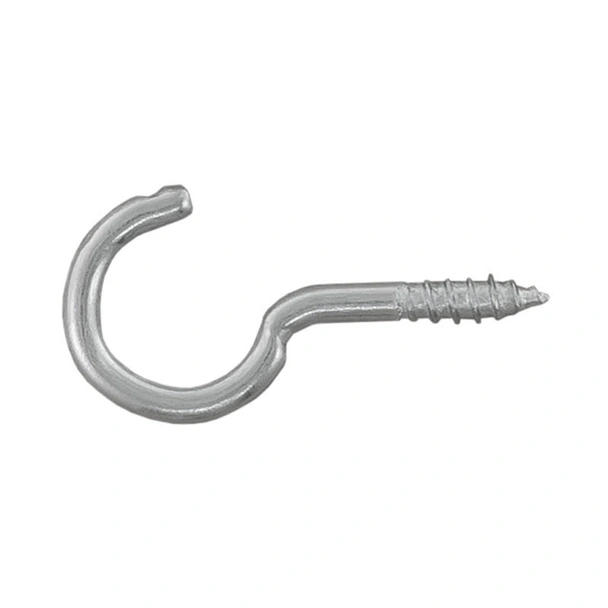 Отворена метална кука от галванично поцинкована стомана с винтова резба за закрепване към дърво. Използва се за монтаж на довършителни интериорни продукти като корнизи, рафтове, шкафове, рамки за картини и др.